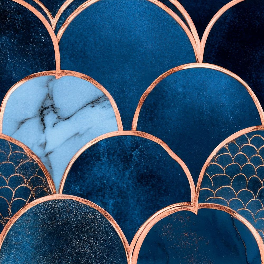 A fascinating interplay of deep blue lustre and elegant copper frame unfolds here, as if the waves of the sea are dancing in gentle arcs. Maritime flair mingles with luxurious marble, while the geometric scales create a harmonious rhythm. A visual feast for the senses that radiates both tranquillity and opulence.