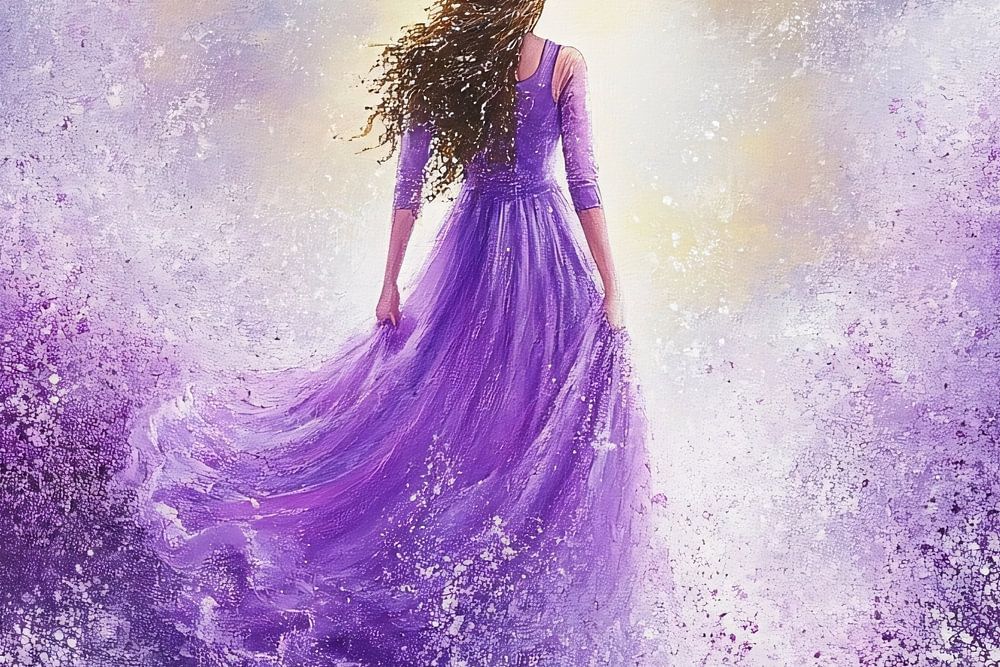 This unique artwork captures an enchanting moment of serenity and strength. It depicts a woman in a beautiful purple dress, standing in a sea of soft colours and light. The sophisticated brushstrokes create a dynamic play between shadow and brightness, creating a dreamy atmosphere. This painting is ideal for any room in need of a touch of elegance and mystery. Perfect for lovers of modern art and sophisticated designs, this artwork brings a sense of inspiration and tranquillity to your home. Add it to your interior and enjoy its artistic beauty daily.