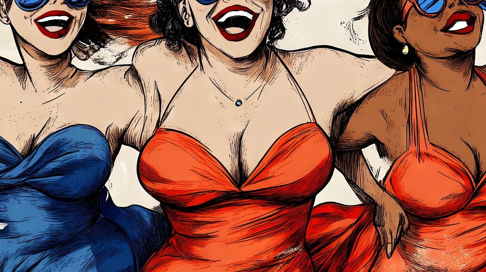 Three cheerful women in elegant evening dresses and sunglasses run laughing across a windy beach - a moment full of freedom, friendship and summer humour.