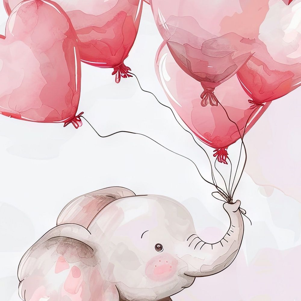 This enchanting watercolour painting shows a cheerful elephant playing with heart balloons in soft pink and pastel shades. Ideal for the nursery, it brings a cheerful atmosphere and a soft colour palette that will make children's hearts beat faster. The lovely details and soft watercolour technique give the picture a special warmth and cuteness. Perfect for parents looking for loving and calming decoration. This cute animal drawing is an eye-catcher in any child's world and goes wonderfully with different interior styles.
