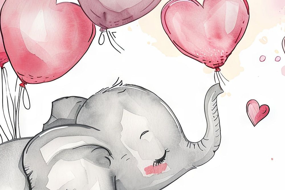 This enchanting watercolour painting shows a cheerful elephant playing with heart balloons in soft pink and pastel shades. Ideal for the nursery, it brings a cheerful atmosphere and a soft colour palette that will make children's hearts beat faster. The lovely details and soft watercolour technique give the picture a special warmth and cuteness. Perfect for parents looking for loving and calming decoration. This cute animal drawing is an eye-catcher in any child's world and goes wonderfully with different interior styles.
