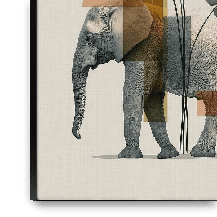 This unique work of art combines the power of a majestic elephant with the soft shapes of tropical monstera leaves and modern geometric elements. Transparent circles and planes in warm earth tones such as terracotta, ochre and beige subtly overlap with the animal and the plant, creating a layered and artistic composition. The balance…