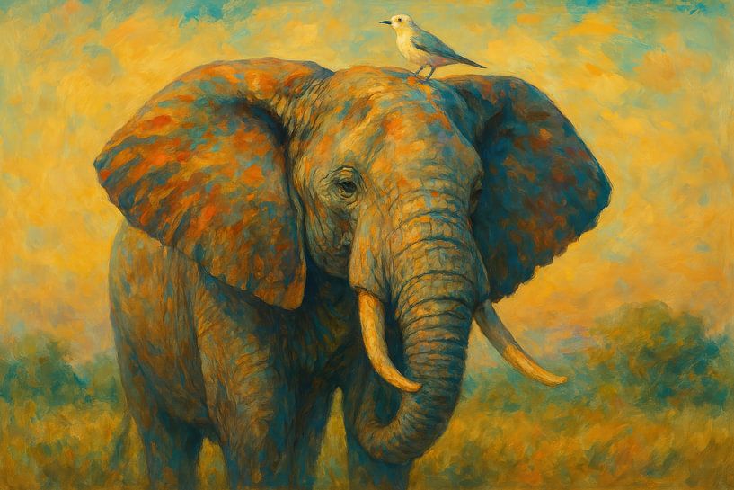 A powerful elephant fills the picture, with wide, flaring ears full of warm orange and cool blue-green accents. Atop its head balances a small bird, a serene detail that suggests peace and companionship. Soft brushstrokes blur the savannah in the background, while the light subtly shines the folds of skin. The warm-cold colour contrast…