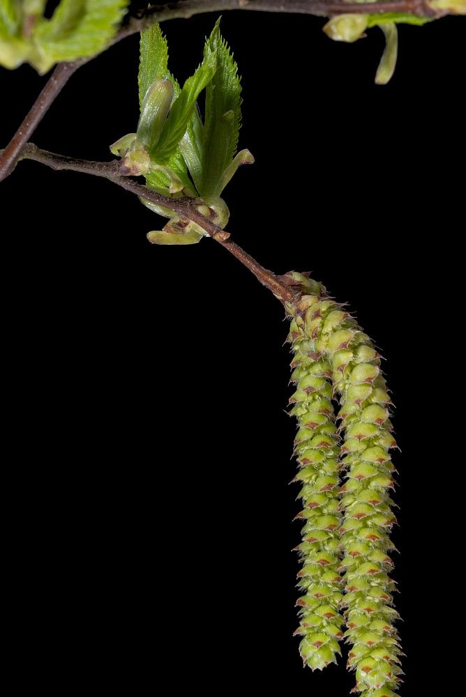 Actually, these are male catkins, male kittens that is. Fresh green in early spring. Germinating leaves and the hangovers almost ready to spread pollen. The branch was photographed against a black background. This quiet image brings tranquility to any interior.