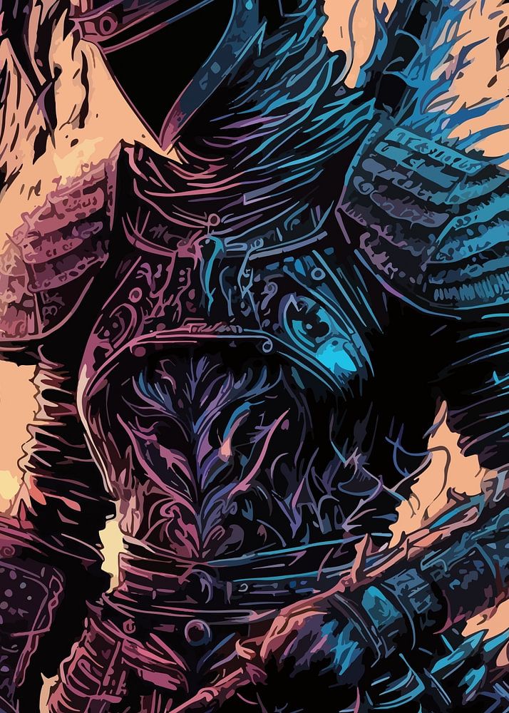 A stoic knight clad in intricately detailed armor emerges from the shadows, surrounded by flames that dance like vengeful spirits. The polished metal glows under hues of burning orange, deep violet, and icy blue, hinting at a past forged in war and fire. With a dagger in hand and a burning will, this lone warrior stands poised between silence and storm.