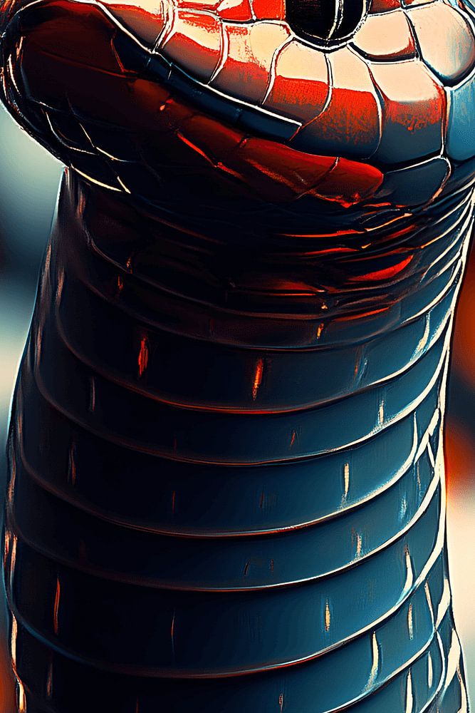 The bright red head of the snake gleams with a futuristic glow, reminiscent of molten armour or alien technology.