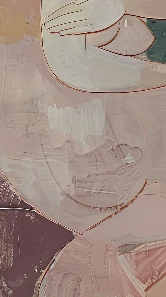 Her head rests gently on her arm, and her face has a serene, almost dreamy expression. The artist uses soft earth tones, such as pale pink, purple and green accents, which create a harmonious and calming atmosphere. The composition is composed of flowing lines and subtle areas of colour that interact and envelop the figure with a sense of warmth and security. The minimalist approach to the human body, combined with the abstract textures in the background, enhances the sense of introspection and self-acceptance. This work invites the viewer to dwell on the themes'of vulnerability, peace and inner reflection.