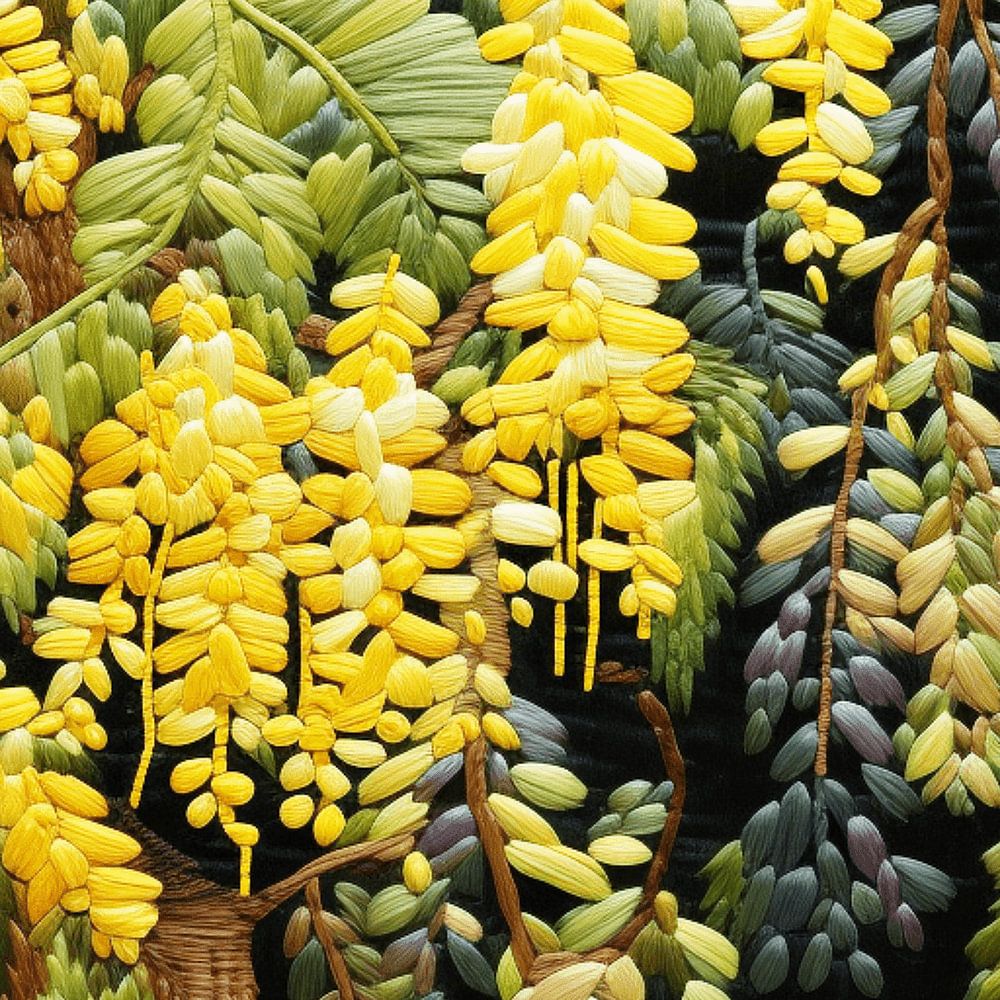 This stunning artwork features a detailed depiction of golden laburnum flowers in the style of tapestry embroidery. The bright yellow strands of flowers hang heavily from the branches, creating a stark contrast to the deep, dark background. The leaves and branches are embroidered with an incredible texture that almost looks like three-dimensional shapes. Each stitch is carefully executed to capture the complexity and different shades of the plant, from the light greens of the young leaves to the darker, almost blue tones of the shadows. The entire image is a masterpiece of craftsmanship that captures the beauty of nature in an artful form.