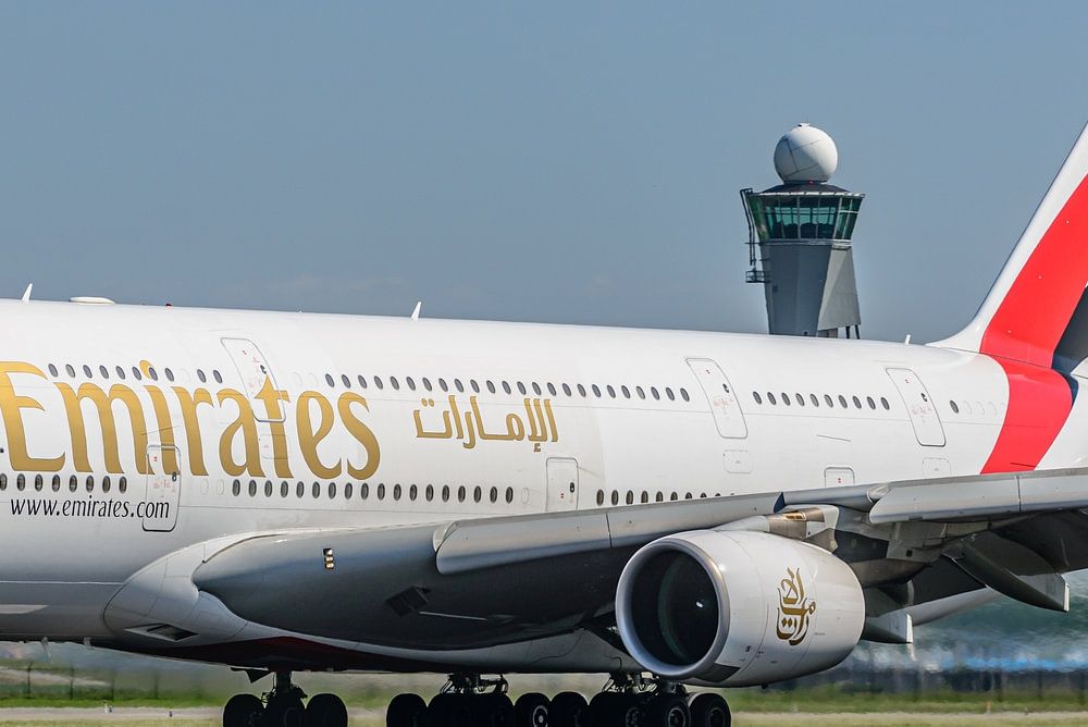 Emirates Airbus A380 (A6-EDR) departs from Polderbaan.