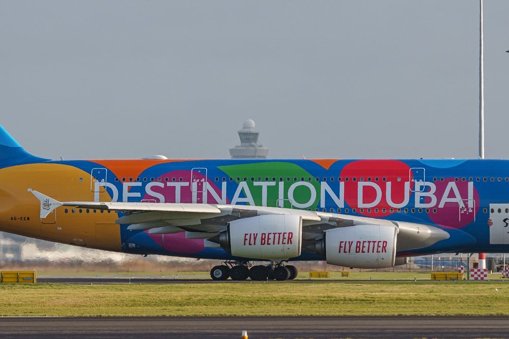 Emirates Airbus A380 with colourful livery Registration: A6-EEW. An Emirates Airbus A380, wearing the colourful livery "Destination Dubai", taxies to the head of the Polderbaan at Schiphol Airport. This photo was taken on 5 February 2023 .