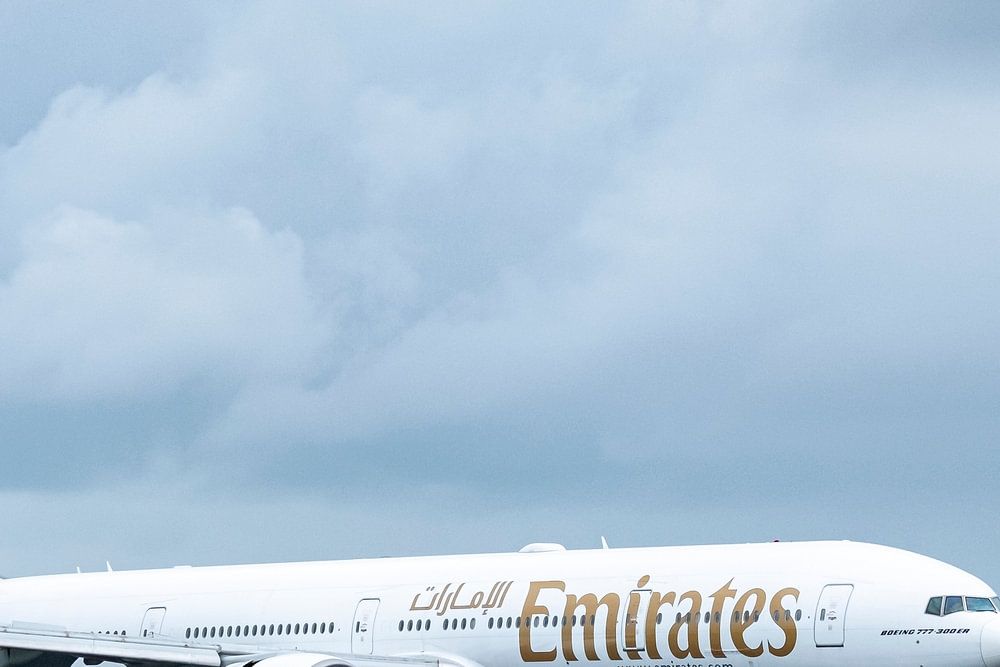 Emirates Airline Boeing 777-300ER landing at Schiphol airport on the Polderbaan during an overcast day at Amsterdam Schiphol airport in The Netherlands. Schiphol is one of the busiest and largest airports in Europe, located near Amsterdam, Netherlands. It serves as a major hub for international flights and is a key gateway to Europe.