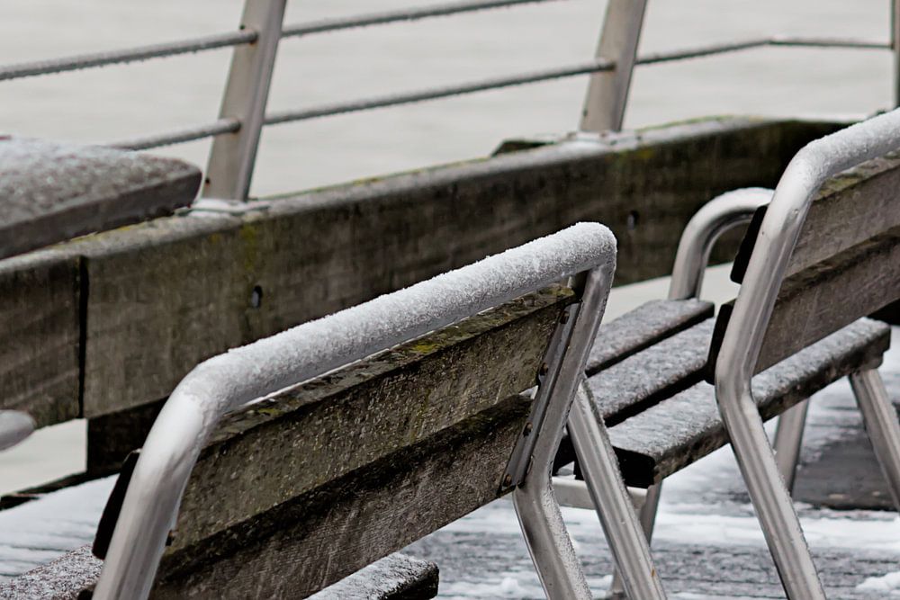 Empty banks along the waterfront in winter, on the Belgian coast in winter. The benches are partially covered with snow.