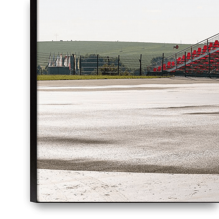 A grandstand with red plastic seats stands unoccupied in the morning sunlight at the Sachsenring race track. The paved area in the foreground is still wet from rain.
