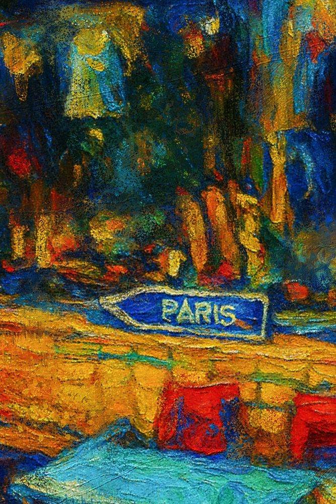 The cobblestones on the ground reflect the vibrancy of the city, while the clothes and objects displayed give the painting a playful and almost nostalgic touch - as if one were on the border between a café and a small flea market. A striking detail is the blue sign with the text "PARIS", which not only stimulates the imagination, but also evokes a sense of travel and longing. It seems as if Brussels here briefly becomes a crossroads of cultures, stories and destinations.