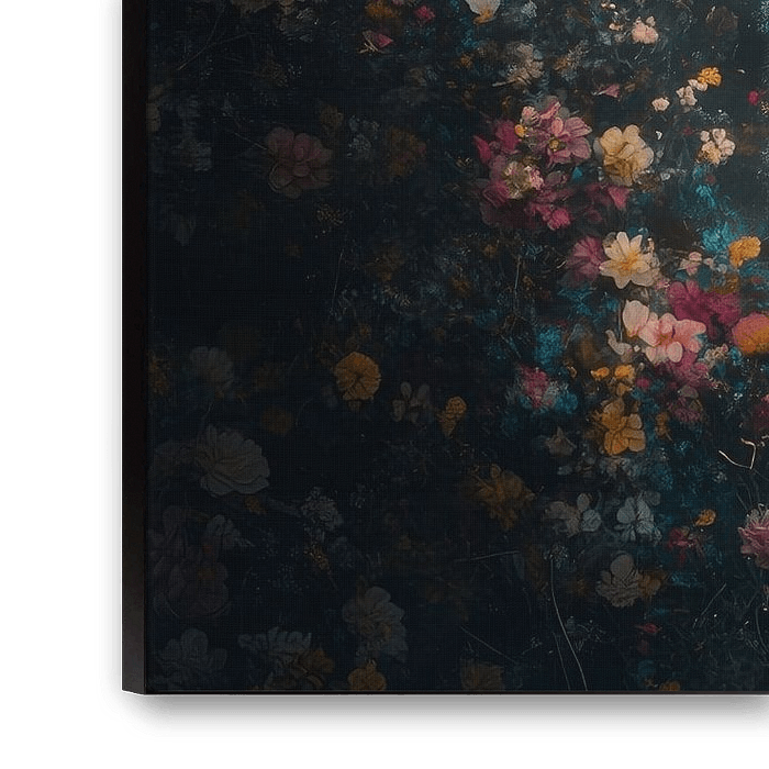 This beautiful image captures the serene presence of a cow with an ornate flower crown, surrounded by a magical field of blooming flowers in various colours. The soft, pastel-coloured roses and wildflowers create a fairytale atmosphere, while the lighting subtly highlights the textures of both the cow's fur and the blossoms. Exuding a unique blend of natural beauty and dreamy fantasy, this artwork adds a sense of tranquillity and elegance to any interior.