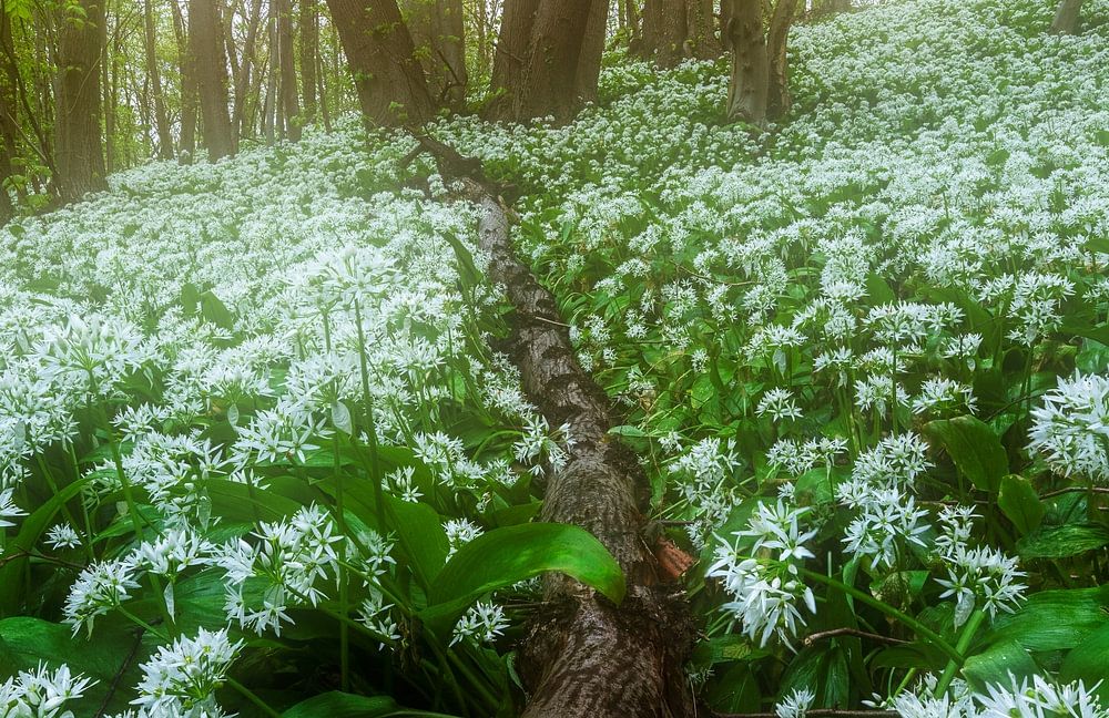 A serene forest floor blanketed with wild garlic. The vibrant green leaves and delicate white blossoms stretch across the ground like a carpet. The muted light strikes through the mist.