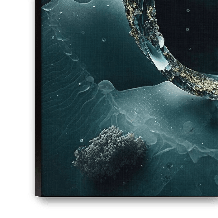 The background, with its deep blue-green tones, gives the impression of a vast, unexplored sea of ice or an alien world. The lighting is soft yet dramatic, casting shadows and highlights that emphasise the textures of the ice, water and glassy ring. This image masterfully blends realism and fantasy, evoking a sense of mystery and wonder in an isolated, dream-like realm.