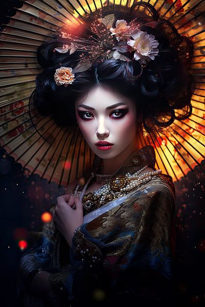 Buy this digital art artwork Enchanting Geisha: Realistic Splendour with Luminous Parasol by Shine By Nous as a reproduction on canvas, ArtFrame, poster and wallpaper, printed on demand in high quality.