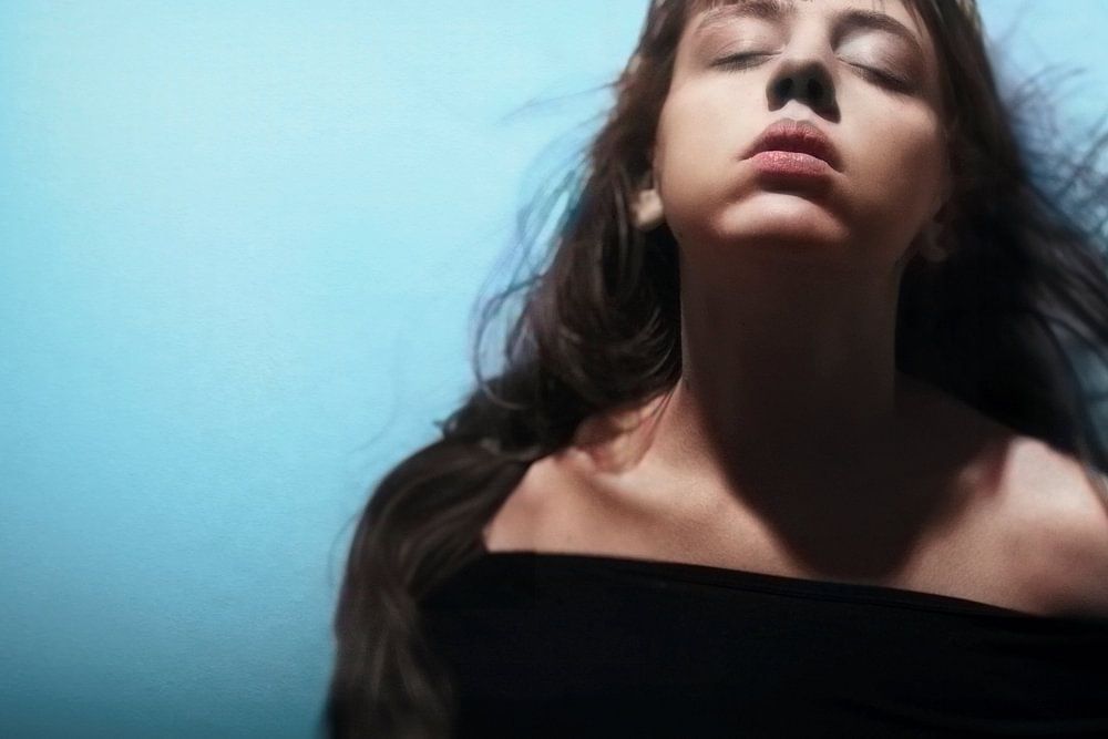 In this enchanting photograph, a woman stands amidst a sea of calm, her blowing hair gently caught by an invisible breeze against a serene cyan background. As her locks dance with ethereal currents, they echo the graceful movements of ocean waves, calling for a sense of fluidity and harmony.