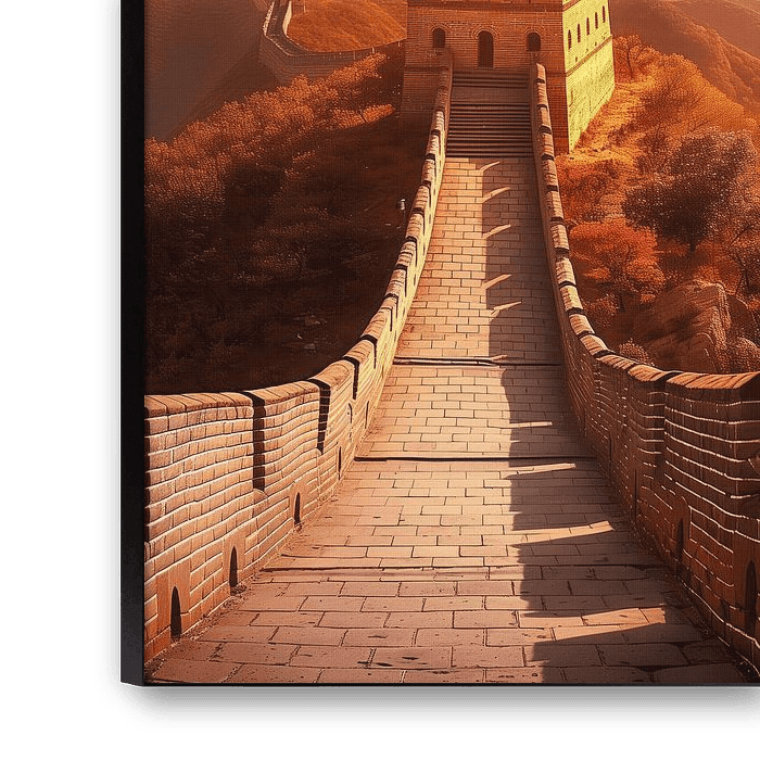 This image shows a breathtaking view of the Great Wall of China during a beautiful sunset. The warm hues of the setting sun, ranging from deep orange to soft pinks and golds, fill the sky and cast a brilliant glow over the landscape. The wall winds majestically through the hills, with an old watchtower in the foreground giving a sense of historical grandeur and timeless beauty. The work gives a beautiful impression of the landscape and brings to life the essence and atmosphere of this iconic location. Vivid colours and light contrasts have been used to create an enchanting and dramatic effect.