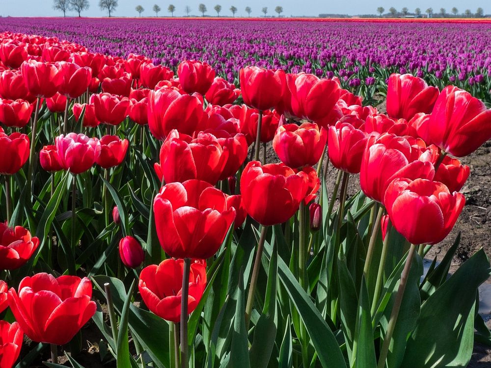 Be mesmerised by the intense beauty of this close-up of red tulips amid a field of purple flowers in Groningen, the Netherlands. Discover the powerful radiance of these vibrant flowers and be amazed by the splendour of Dutch spring. ?✨