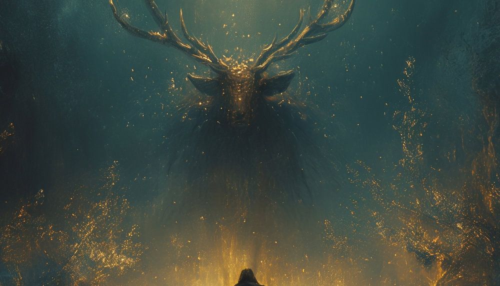 A person in a dark coat steps towards a gigantic, glowing stag in a snow-covered forest clearing. The stag, whose antlers look like a branch lit from within, radiates a warm, golden light that transforms the surrounding forest into a magical scene. The snow on the ground reflects the light and makes the whole scene look like a vision from a dream. The deer standing majestically and calmly in the clearing could be a guardian of the forest or a manifestation of an ancient deity. The viewer feels as if drawn into a world in which the boundary between physical reality and the realm of the mysterious becomes blurred.