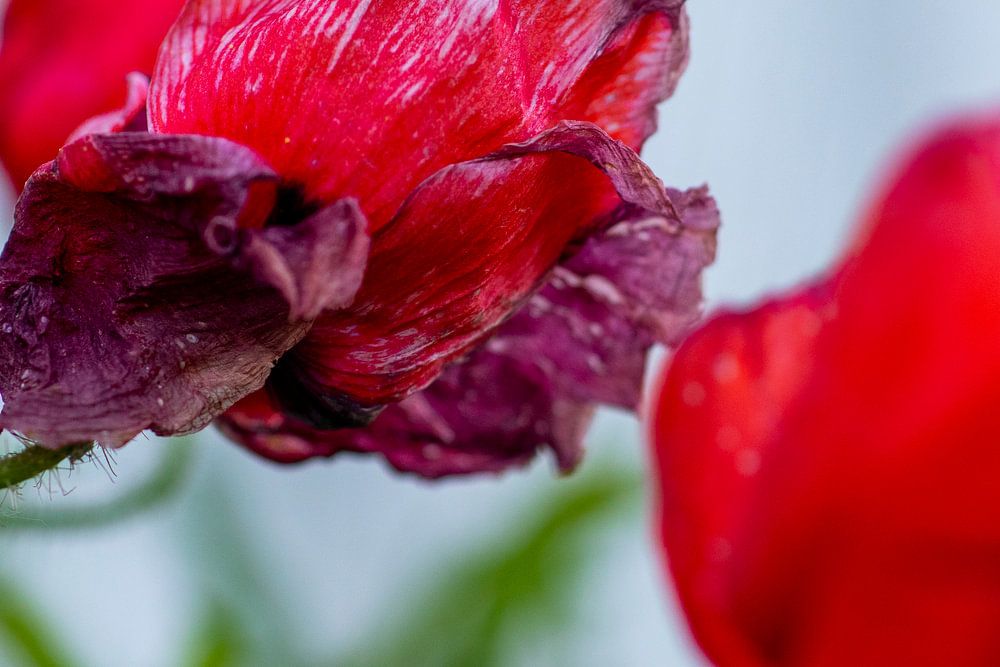 The distinctive colour of the poppy is red. At the base of the petals a black part becomes visible. The four leaves of the flower are larger than we are used to from flowers, so they overlap to a large extent. The flower has hairs on both stems and leaves.