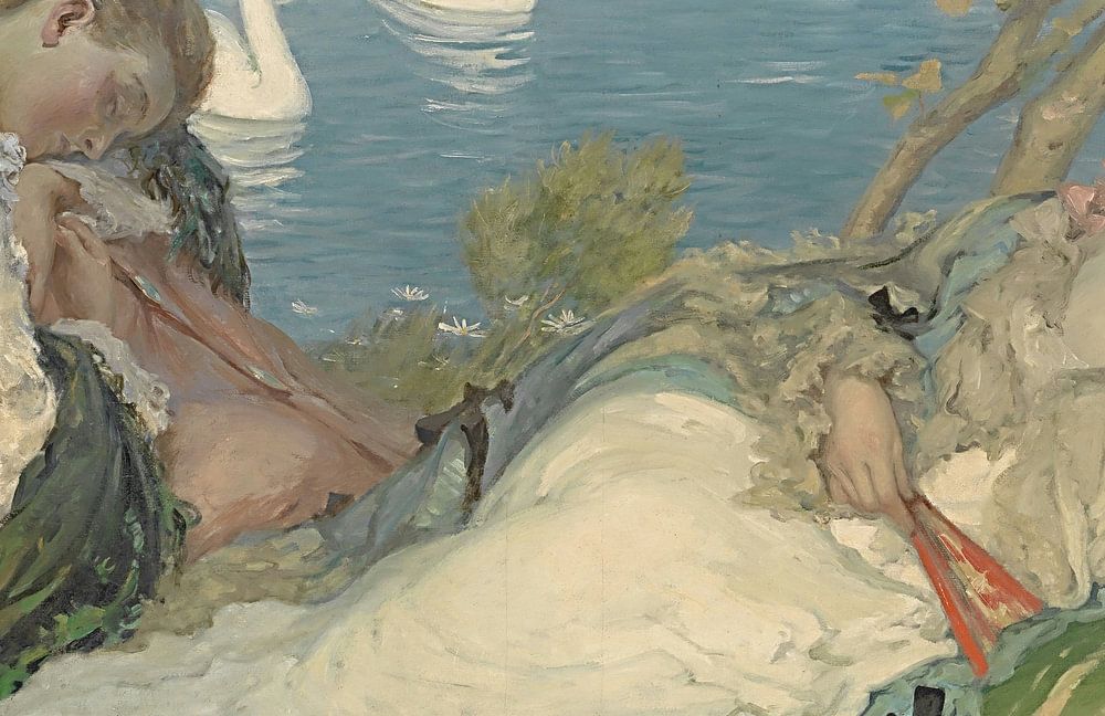 The model for the sleeping figure in this painting is Bunny’s wife, Jeanne. They had met in 1895 and married in 1902. She would become his principal model, her graceful form and sensuous features repeated in numerous works and embodying Bunny’s feminine ideal. From the turn of the century Bunny increasingly depicted groups of female figures, often shown relaxing, dreaming, dressing or undressing by expanses of water. In this work Bunny has included a red rose, traditionally a symbol of love and sensuous power, as well as a white swan, symbolic of grace and beauty and a recurring motif of Belle Époque culture. The small dog is often used by artists to symbolise marital fidelity.