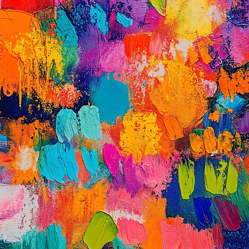 An abstract artwork with an explosion of colours, featuring thick brushstrokes, vibrant and bright hues and a palette knife style. Exuding energy and excitement, this artwork grabs your attention with its dynamic impressionistic composition and vibrant palette.