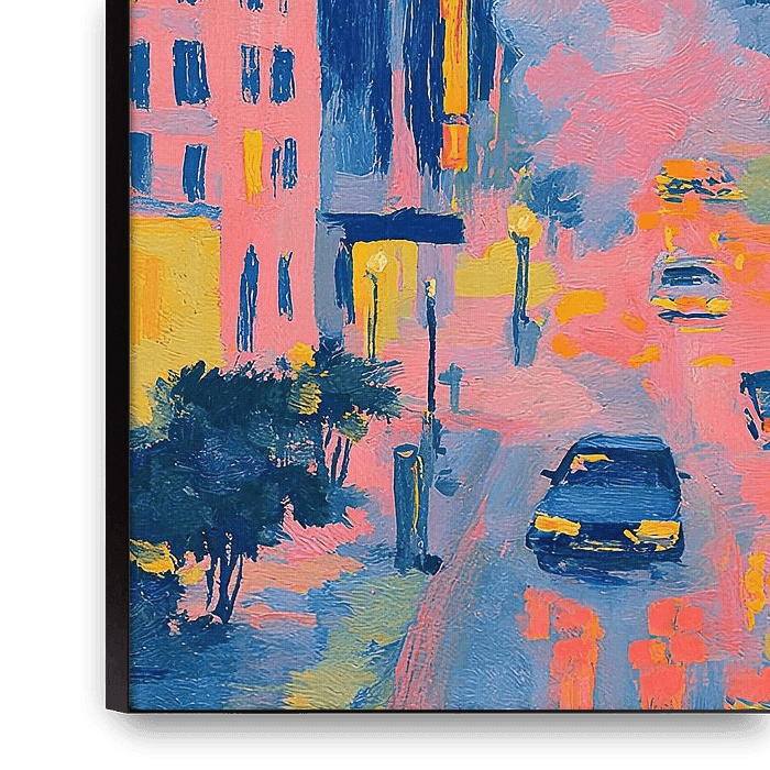 This expressive painting captures the vibrant atmosphere of a city street in the transitional light of day. In a bold, expressive style with broad brushstrokes, deep shades of blue, violet and pink dominate the scene. In the centre, a dark vehicle moves towards the viewer, while behind it, rising mist or smoke in pastel pink tones…