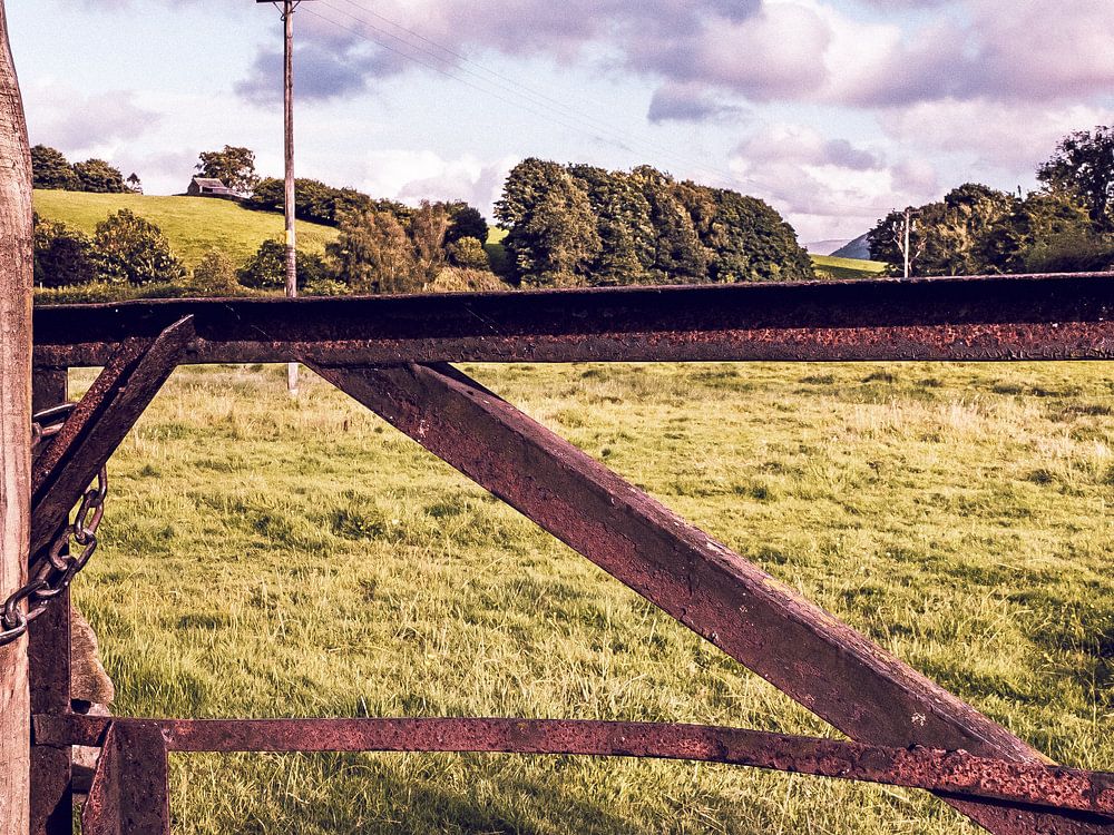 English landscape with grassland and hills. In the foreground is a square roughwood post against which stands a simple iron fence. A small chain link keeps it closed. Towards the wooden post begins a traditional stone wall separating almost all the plots. There is sunshine and in the distance we can see some clouds against a blue sky. A few telephone wires run through the sky. The cattle, almost always sheep, have been taken to another field.