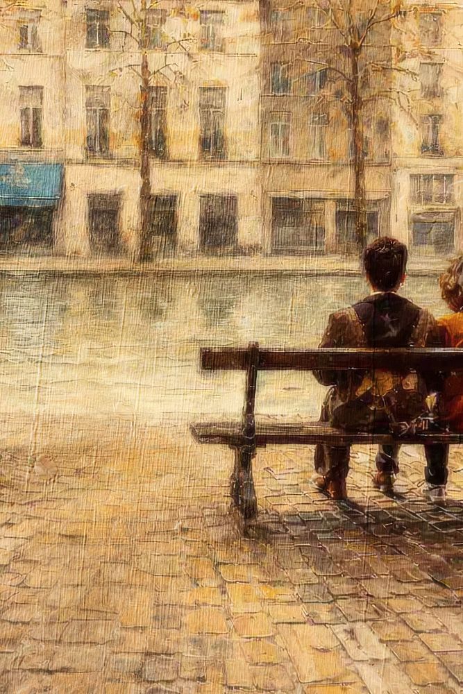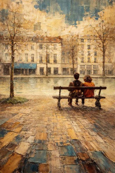 This abstract work impressively brings to life an atmospheric moment by the water’s edge. The artwork depicts a soothing scene of two people sitting together on a bench beside an idyllic canal, surrounded by a charming urban landscape. The warm and refined impasto painting style, characterised by rich textures and visible brushstrokes,…