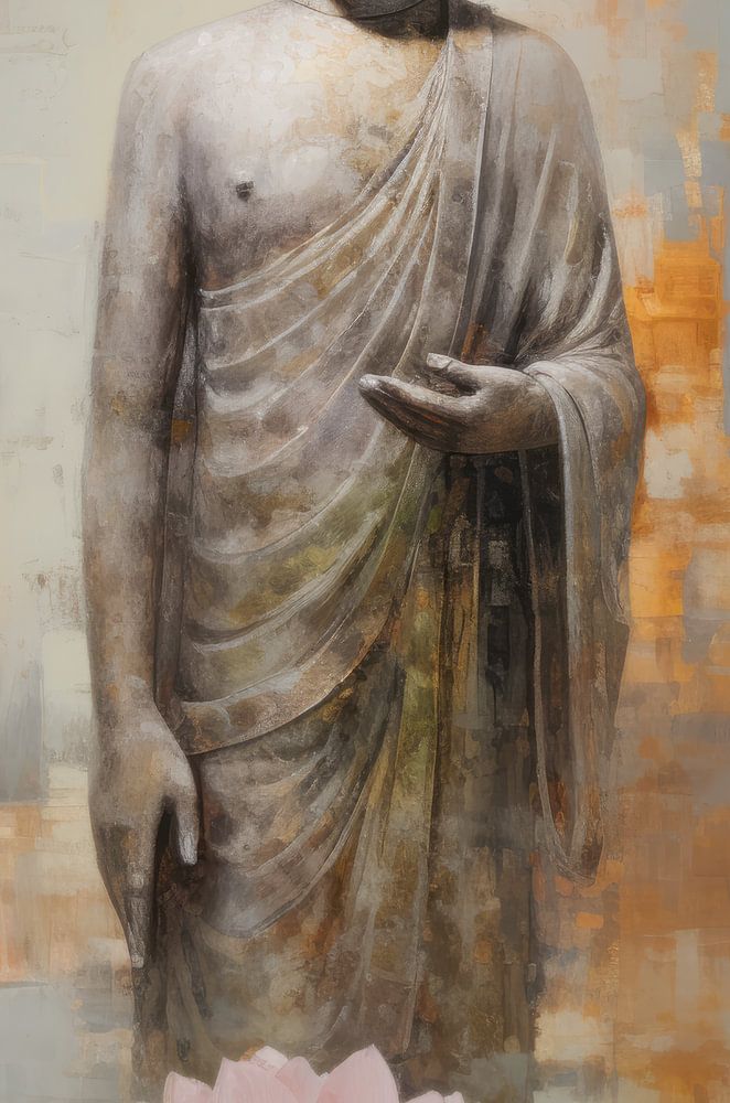 This breathtaking digital painting depicts a serene Buddha, symbolising the peace and enlightenment that many seek in their spiritual journey. The detailed look of the Buddha, against the hazy background of pastel hues, conveys a dreamy and meditative atmosphere. Notable in his hand is a delicate lotus flower, considered a symbol of purity, enlightenment and rebirth in many Eastern cultures. The fact that Buddha holds the flower so carefully suggests a deep connection and respect for nature and life itself.