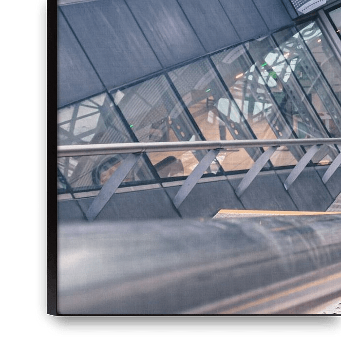 The futuristic-looking entrance to the Brussels-Luxembourg station in the European quarter of Brussels. The leading lines of the banisters lead you to the middle of the picture.