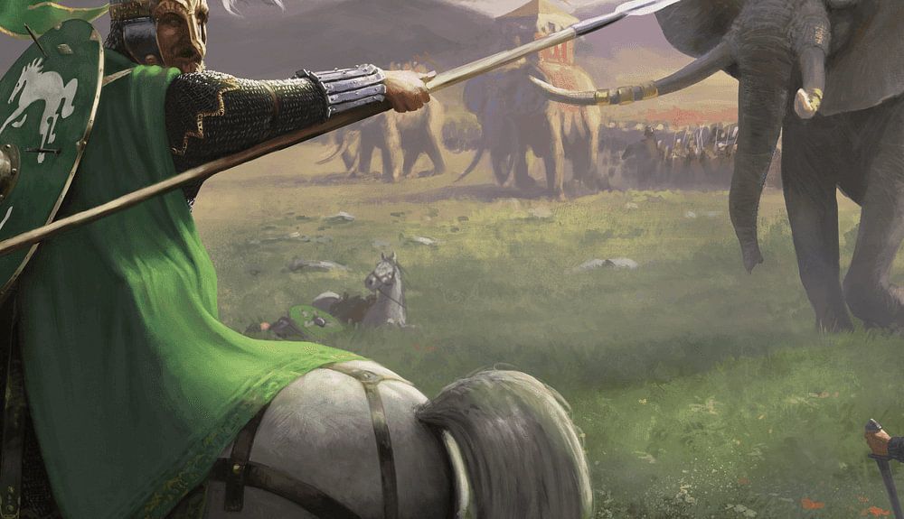 The battle on the Pelennor fields; Éomer leads the Rohirrim deep into battle after he thinks his sister has been killed. His anger betrays him and he runs his troops into the Haradrim, who use their elephants (Mûmakil) to terrify the horses of the Rohirrim. A perilous moment from which there seems to be no escape....