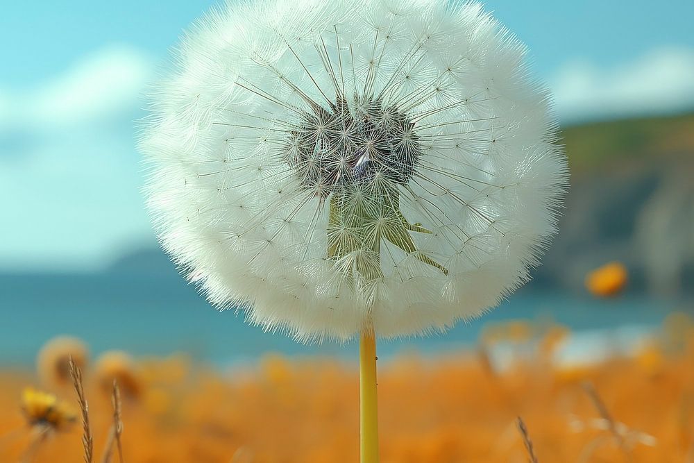 "Ephemeral Poise" is an evocative photograph capturing the delicate beauty of a dandelion seed head, poised against a sea of golden flora. Standing tall, this single dandelion takes centre stage with its sphere of ethereal wisps, ready to be taken by the breeze. The backdrop features a stunning coastal landscape, where the vivid blue of the sea meets the warmth of a sunlit meadow. The simplicity of the subject contrasts with the complex natural elements that surround it, highlighting the dandelion's transient yet timeless grace. This image is a celebration of life's fleeting moments, the quiet beauty in the mundane, and nature's cycle of renewal. The dandelion, often seen as a humble weed, is elevated to a symbol of resilience and the potential for new beginnings. It's a photographic reminder to cherish the small wonders that abound in our world.