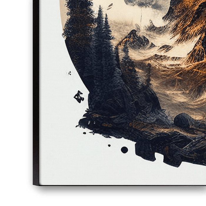 The colour palette mixes earthy browns, deep blacks and shimmering whites, creating a striking contrast that evokes both warmth and cold. Combining realism with fantasy elements, the artwork is a mesmerising depiction of high alpine wilderness, solitude and exploration.