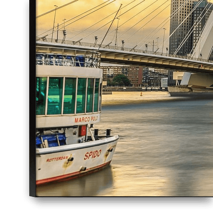 Buy this of Rotterdam Erasmus Bridge Evening from Willemskade day by Michael van der Burg on canvas, ArtFrame, poster and wallpaper, printed on demand in high quality.