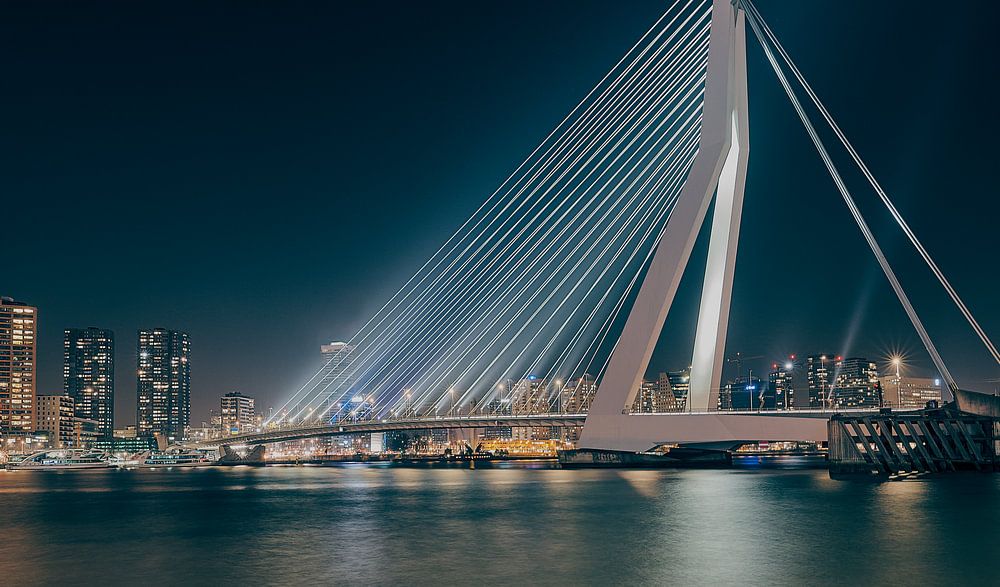 The photo shows the Erasmus Bridge in Rotterdam, photographed from the Holland Amerikakade.