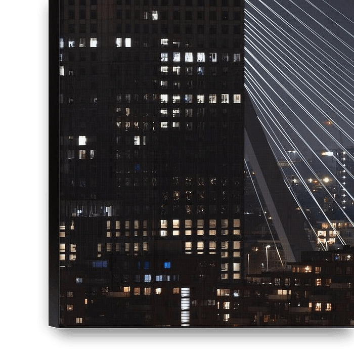 A photo of the Erasmus Bridge in Rotterdam, photographed in the evening. As the bridges in Rotterdam are illuminated in the evening, that's a perfect time to capture it.