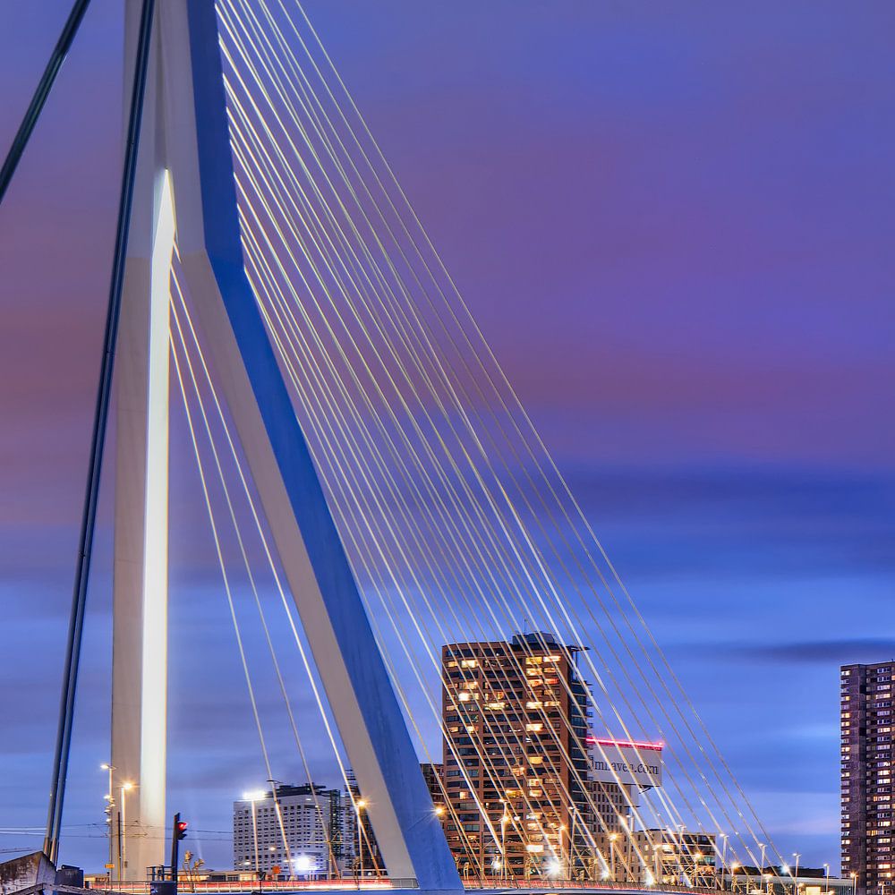 Cityscape with Illuminated Erasmus bridge Rotterdam at colorful twilight reflected in te river Maas
