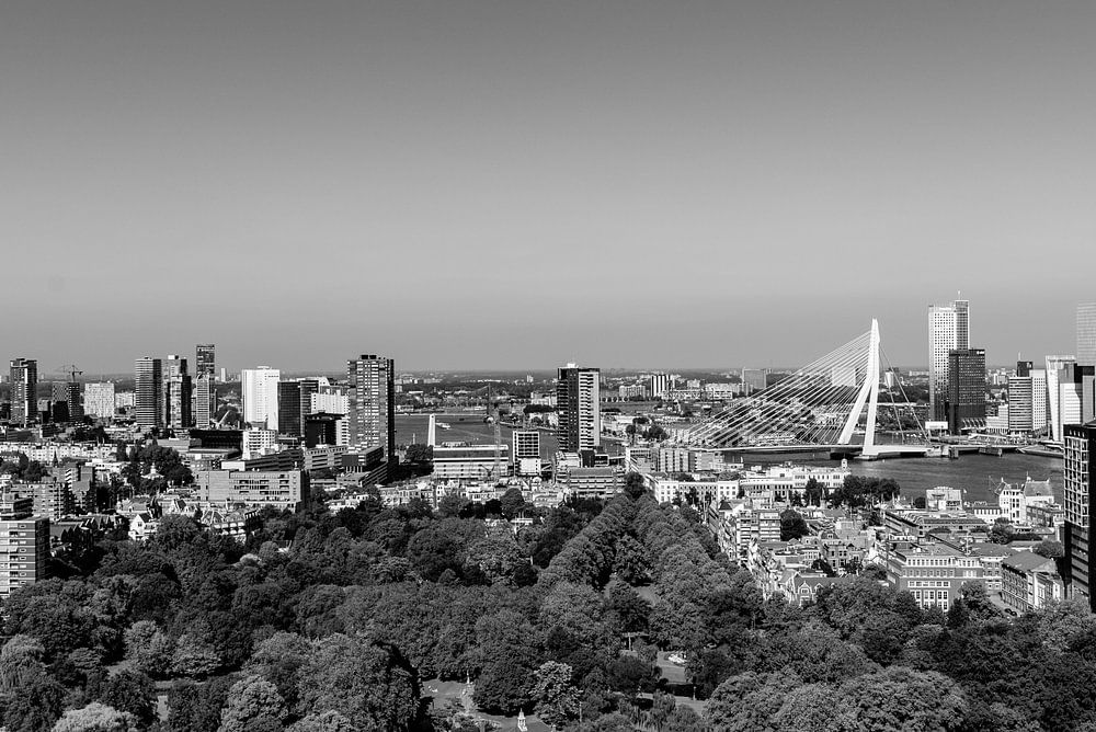 Een overzicht van de stad Rotterdam vanaf de Euromast met de Erasmusbrug centraal in beeld.