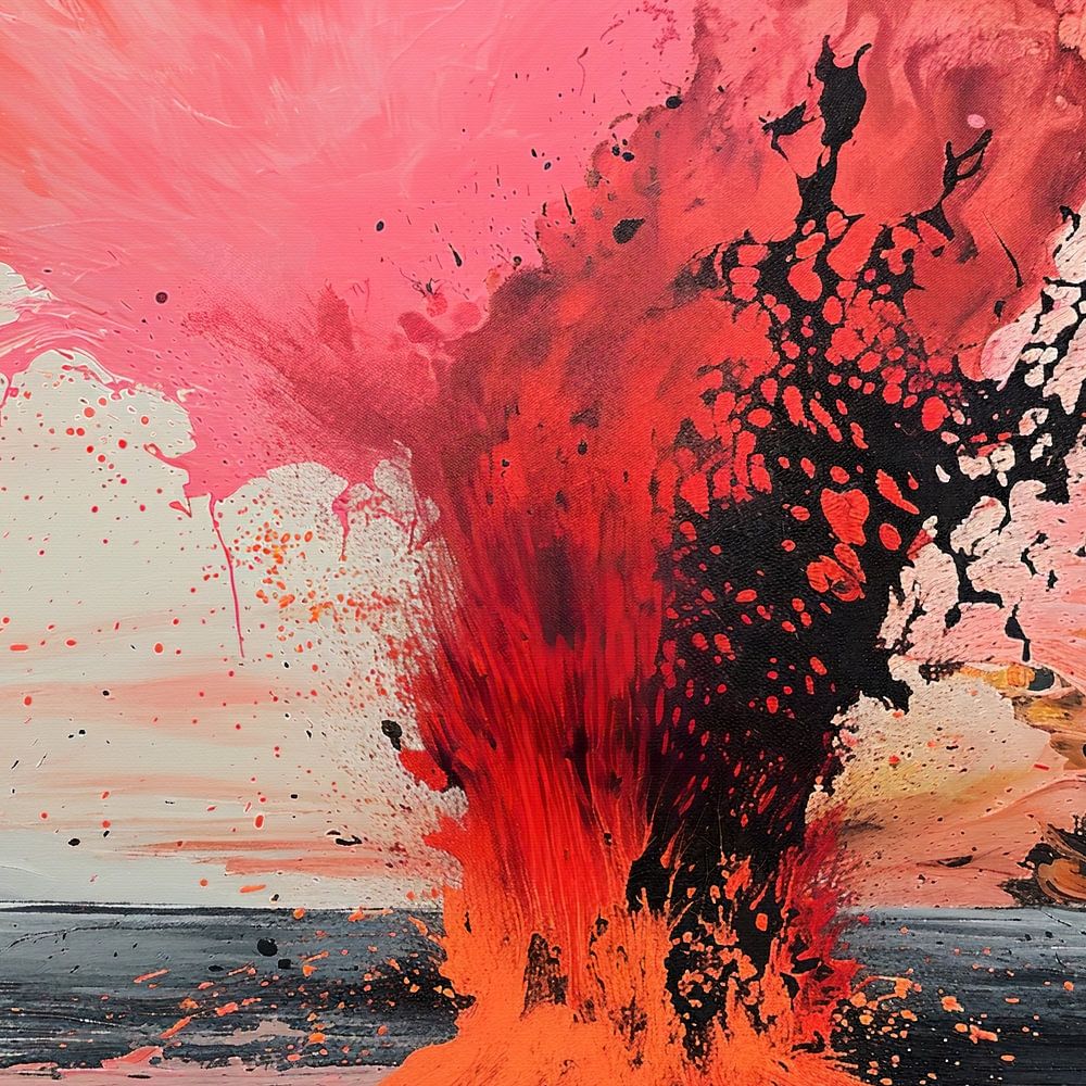 This dynamic composition captures the essence of untamed energy and passion, with an explosion of red and pink rising from the centre of the canvas. The colours flow apart with powerful movements, as if representing a volcanic eruption of creativity and intensity. The contrast between the dark and light tones symbolises the constant struggle between light and darkness, joy and anger, and the unpredictable nature of our deepest feelings.