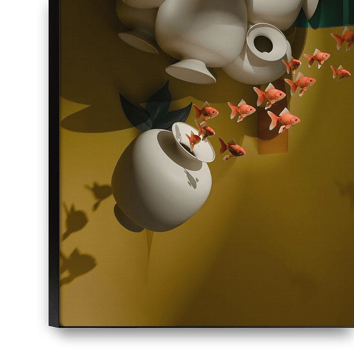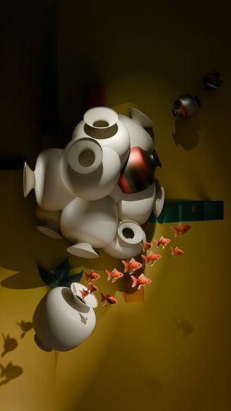 In this intriguing work, empty vases crowd into an almost sculptural knot, as if they are holding each other in an attempt not to fall apart. From one of the vases, goldfish escape - small, vibrant accents making their way towards freedom.