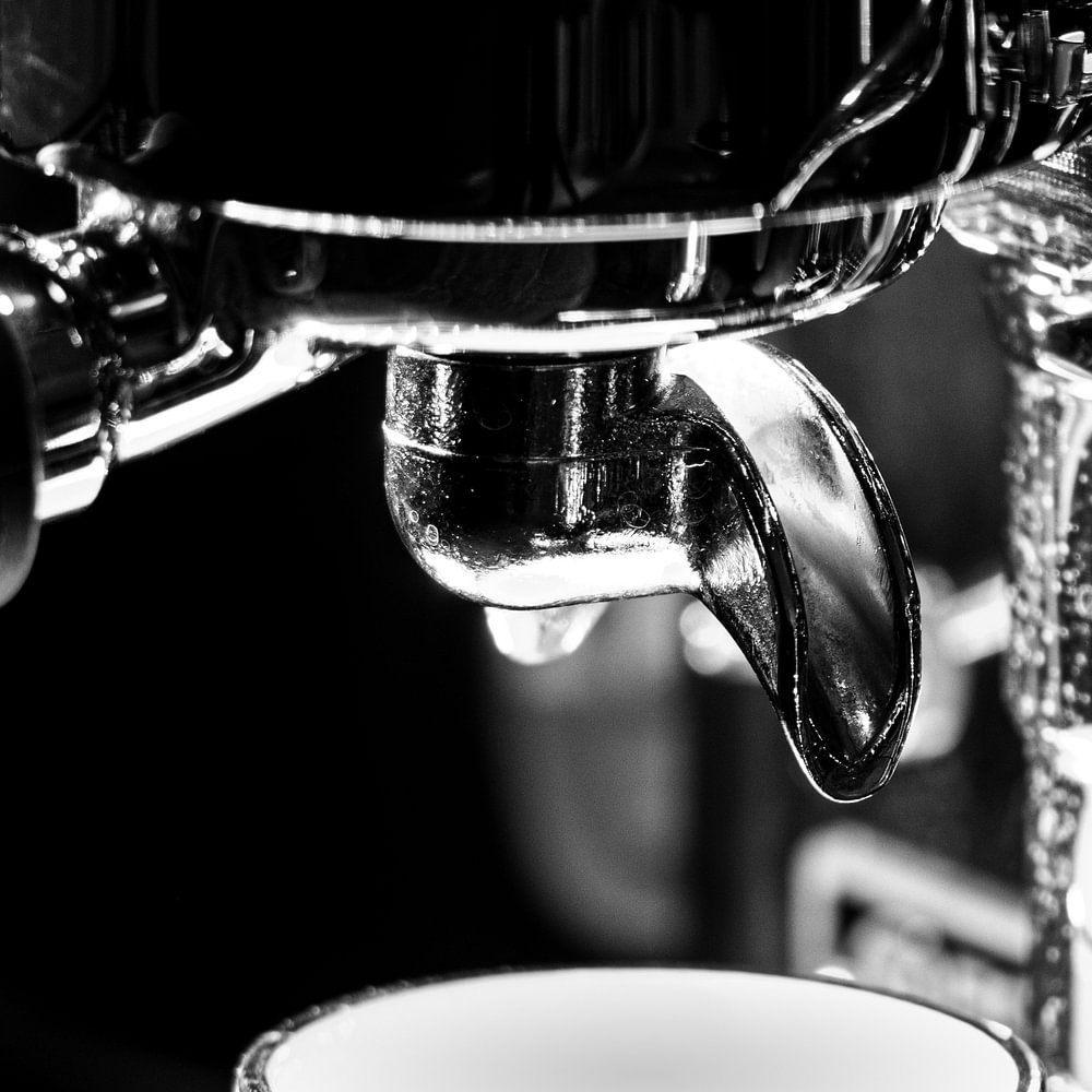 This picture shows a detail of the brewing group and filter carrier of an espresso machine.