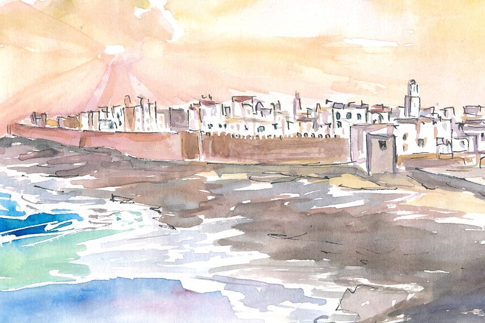 Buy this painting Essaouira Morocco view of medina with breaking ocean waves by Markus Bleichner as a reproduction on canvas, ArtFrame, poster and wallpaper, printed on demand in high quality.
