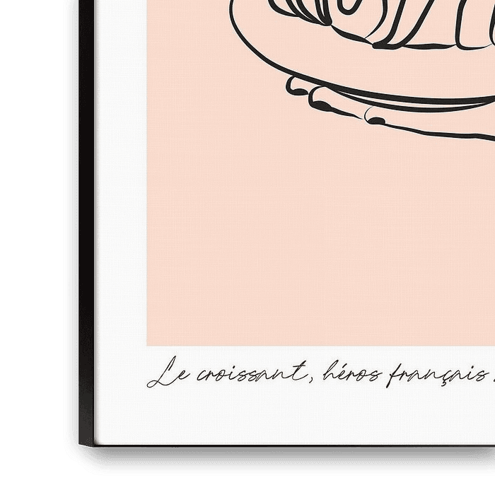 Simple and elegant editorial style. Charming illustration of a croissant with typography in a noble serif font and a soft rose colour. For all those with a sweet tooth, croissant lovers and fans of France. Equally suitable as a special decoration for the kitchen, a café, patisserie, bakery...