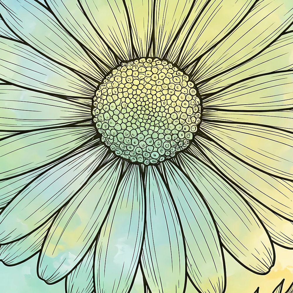 A delicate line art illustration of a daisy flower, gently shaded with soft washes of blue, green, and yellow watercolor. The intricate details of the petals and the textured center are highlighted against the dreamy, blended background, evoking a sense of tranquility and natural beauty.