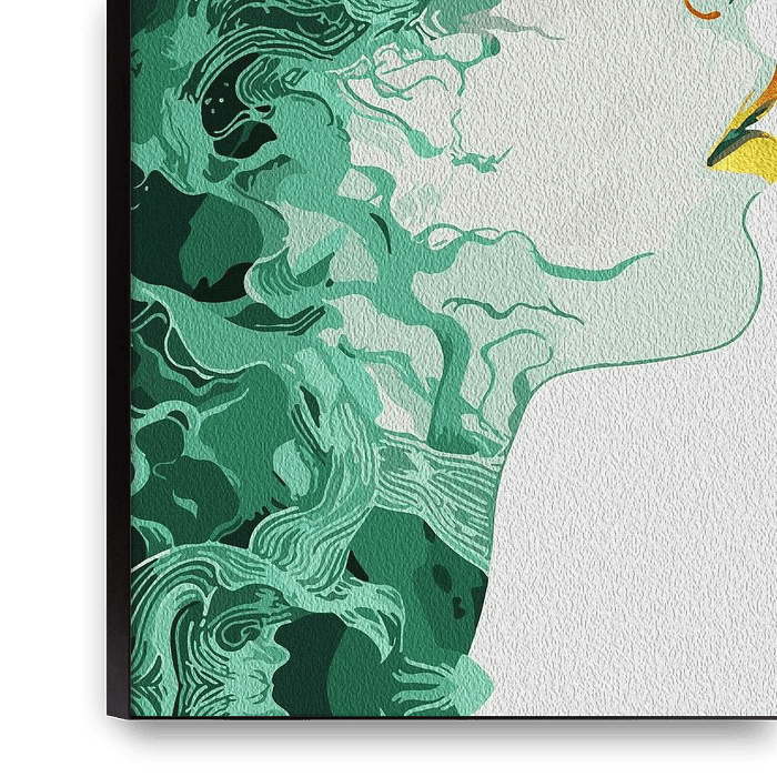 A mesmerizing digital artwork featuring two mirrored feminine faces seamlessly blending into abstract, nature-inspired waves. With a harmonious mix of deep green and soft cream tones, this piece evokes a sense of balance, tranquility, and introspection. The intricate details of flowing hair intertwining with organic shapes create a…