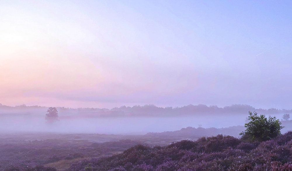 Vast purple heathlands slowly fade into a gentle morning mist. The pastel colours and layered depth give this piece a dreamy, almost painterly quality. A soothing work of art that brings a sense of space and balance.